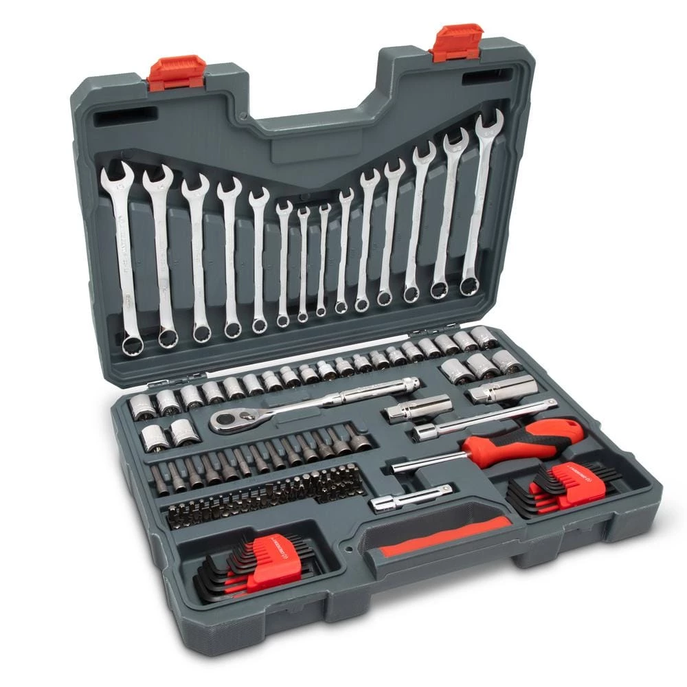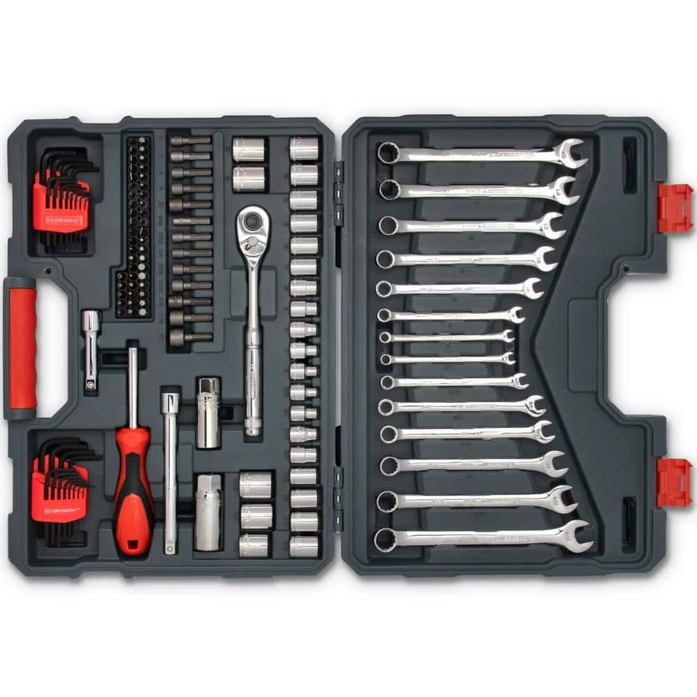 This Crescent general purpose mechanic’s tool set contains a carefully selected assortment of professional tools for industrial jobs. It includes durable, full polish chrome alloy steel ratchets, drive tools and sockets that are reliable and resist rust and wear. Also included in the CTK128C set are full polish combination wrenches, an adjustable wrench, pliers, bits, hex keys and screwdrivers. The heavy-duty blow-molded case has steel hinges, latches on top and sides and a designated spot for each tool. All tools in this set meet the new ANSI and ASME specifications and come with a full satisfaction guarantee. Crescent – trusted by the trades to provide quality tools since 1907.