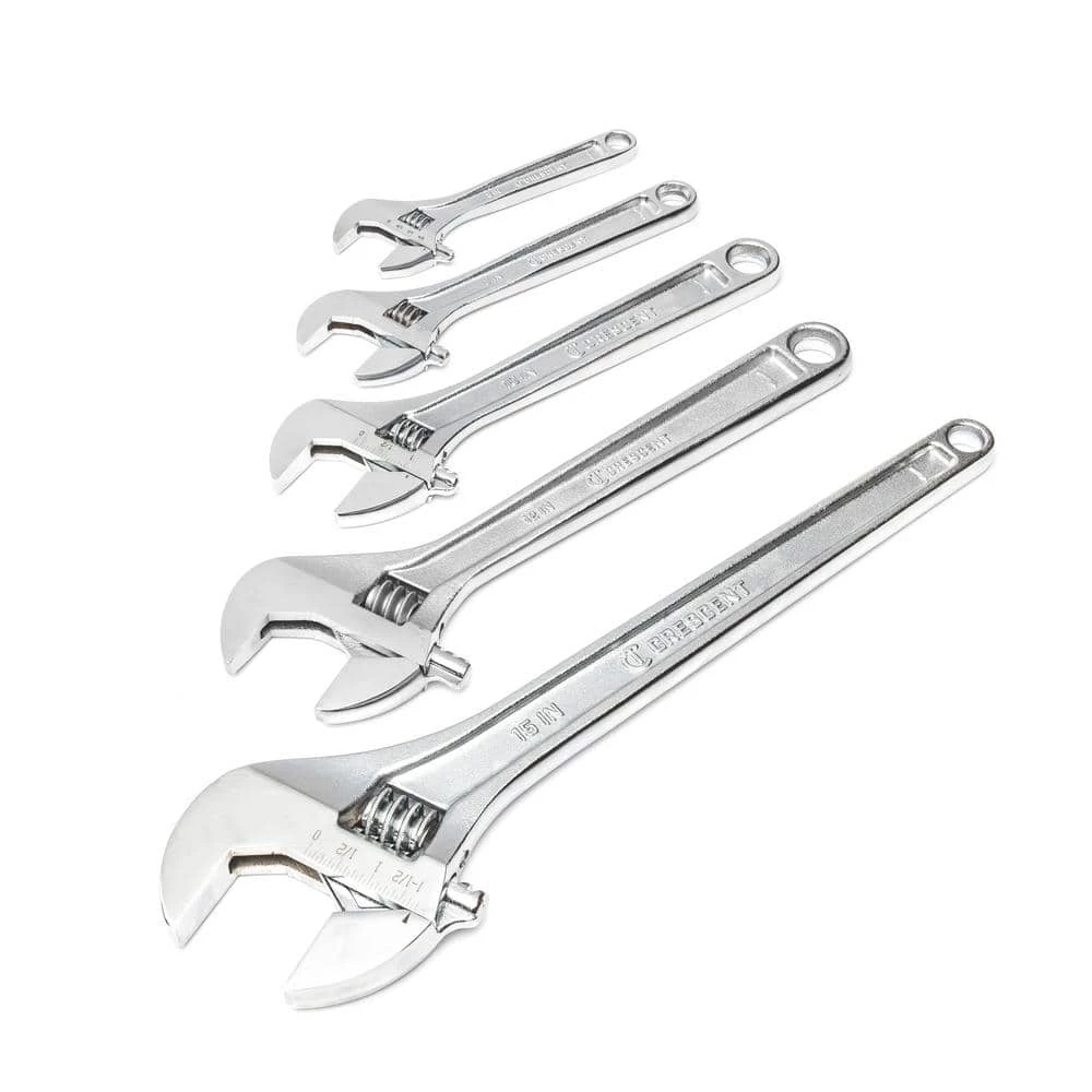 Crescent is a premier hand tool brand, offering a variety of tools to the professional tradesman and home DIYers looking for quality, durability and innovative functional in their tool box. The larger size (12 in. and 15 in.) wrenches have tapered handles allowing for a better 2-hand grip and less weight. Wrenches feature a hex jaw design to reduce slippage by gripping fasteners tightly. For easy identification, wrenches have laser etched scales in both SAE standard and metric sizes. This Crescent 5-Piece Master Adjustable Wrench Set is a staple for any tool box and features wide-capacity jaws to accommodate a variety of fastener sizes.