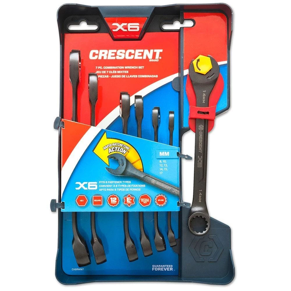 The Crescent X6 7-Piece combination wrench set provides you with the innovation of the X6 design in the box end. It allows you to grip 6 different types of fasteners at the convenience of ratcheting in the open end. This set includes the following sizes: 8, 10, 12, 13, 14, 15 and 17mm.