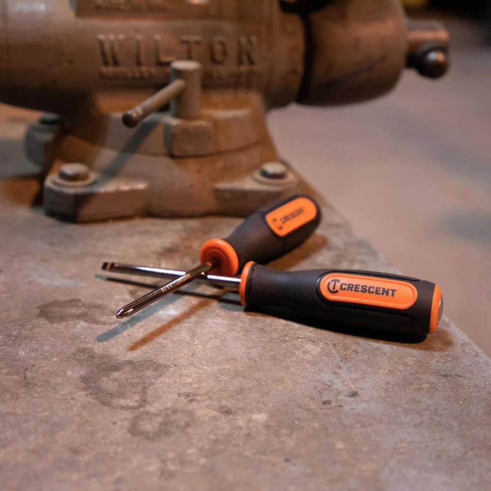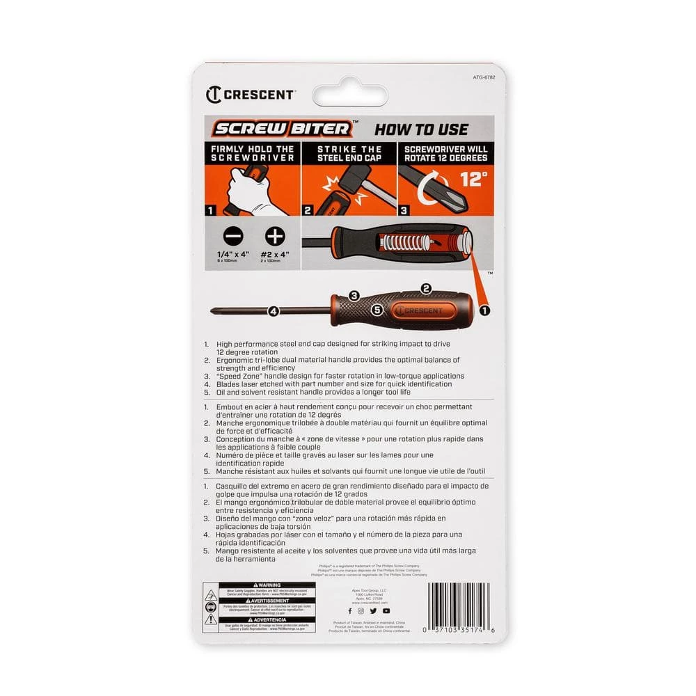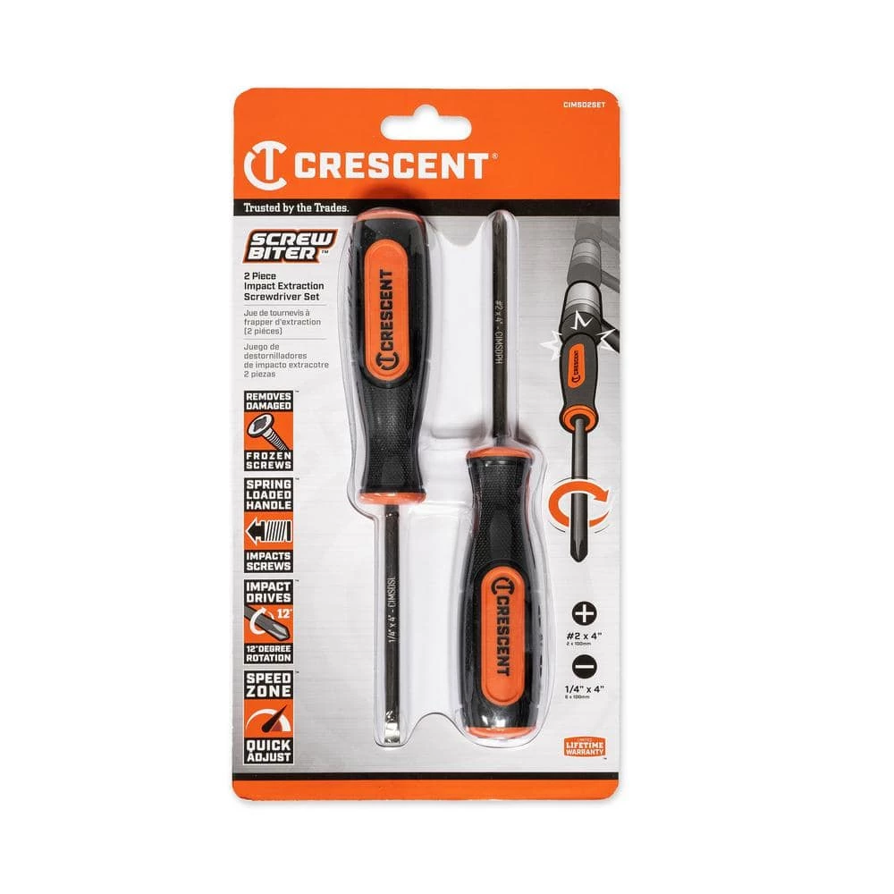 Screw Biter impact screwdrivers offer the convenience of a standard screwdriver with the extraction abilities of a dedicated impact driver, loosing rusted, stripped, or other difficult-to-remove screws. Their high-performance steel handle end cap transfers impact shock to an internal mechanism that rotates the heat-treated alloy steel shaft 12° when struck. High-strength tips are rust-resistant nickel chrome plated.