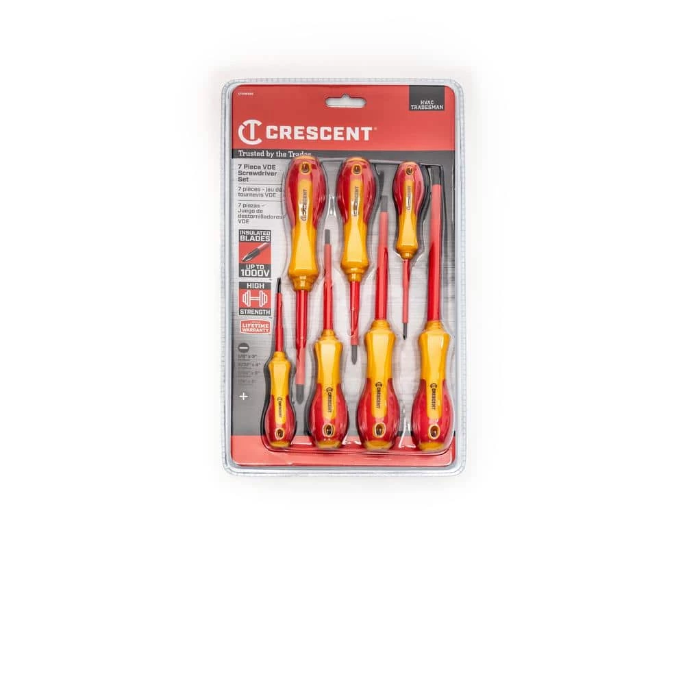 The Crescent VDE screwdriver set comes with 7 insulated-handle screwdrivers in both Philips 3 and Slotted 4 sizes. This 7-piece VDE screwdriver set is rated up to 1000-Volt but tested up to 10,000. Backed by our VDE certification, this set is a complete offering to get the job done.