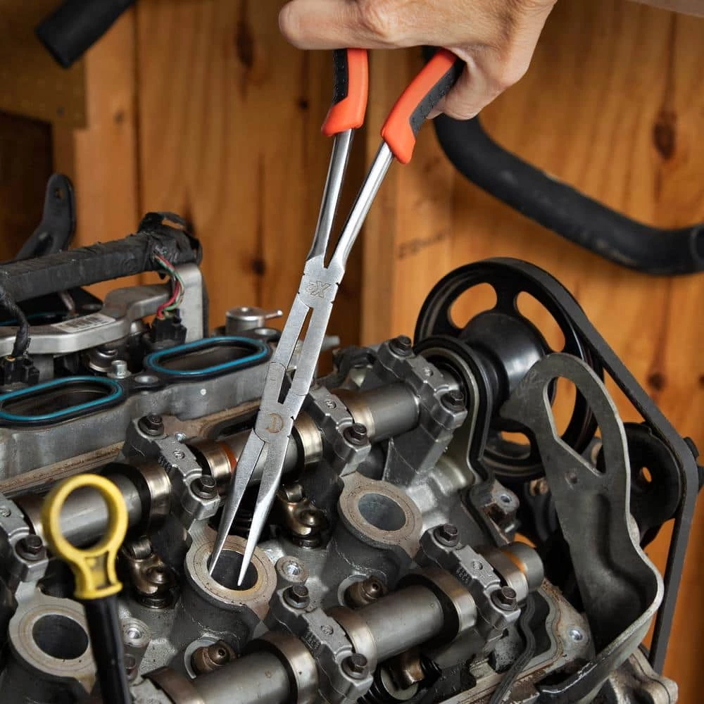 Crescent X2 Long Reach Pliers are designed with double joints so that the jaws can open a greater distance than the handles for improved access in tight spots. This 2-Pack Set comes with both Straight Jaw and Bent-Nose Pliers. They are manufactured from Alloy Steel that Resist Rust and Corrosion for Long Life and Durability.